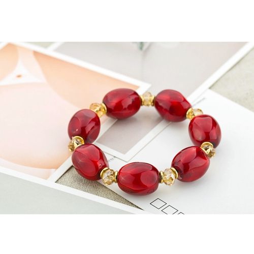 Стилна гривна изработена от мъниста в рубинено червен цвят, подчертани от висококачествени Австрийски кристали в цвят шампанско. Металната част е от висококачествена бижутерийна сплав /не съдържа никел/ с 14К златно покритие.