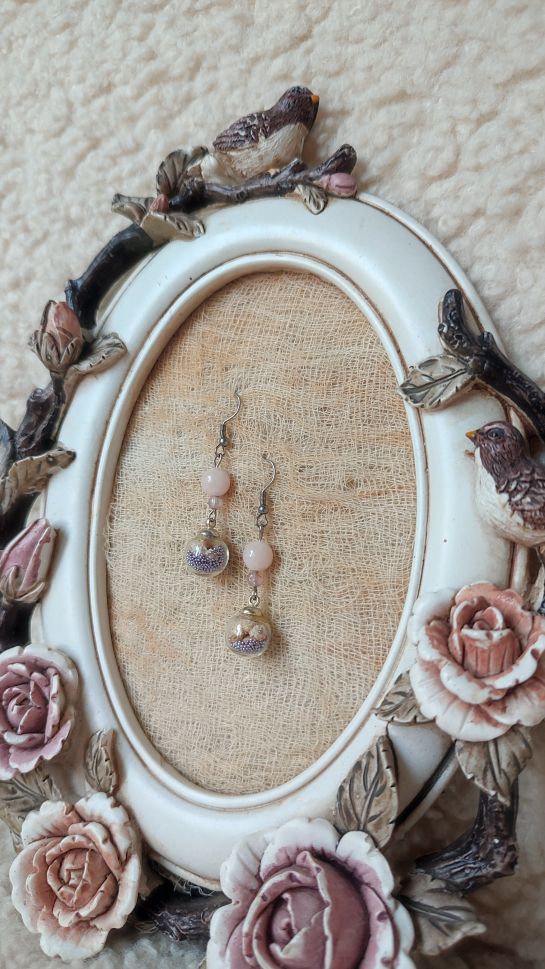 Диаметър на стъклената сфера – 1 см; материали – хербаризирана гипсофила, стъклени перли, стомана, ахат, лунен камък; дължина на обеците – 4 см