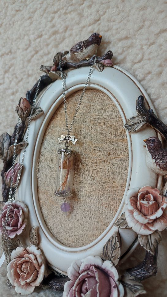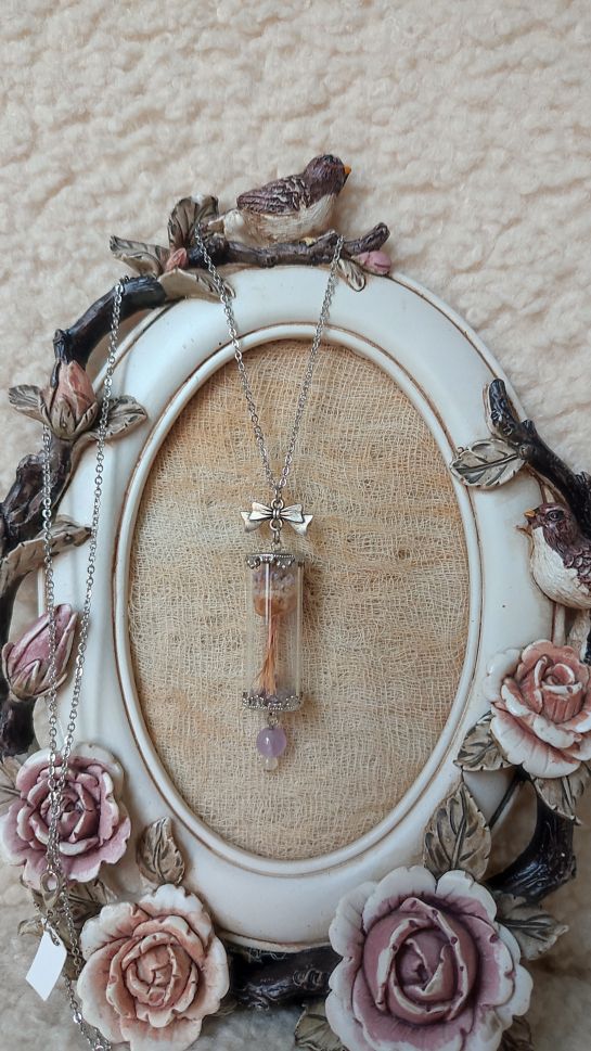 Колие Армерия ; материали – хербаризирана Армерия, стомана, аметист , кварц