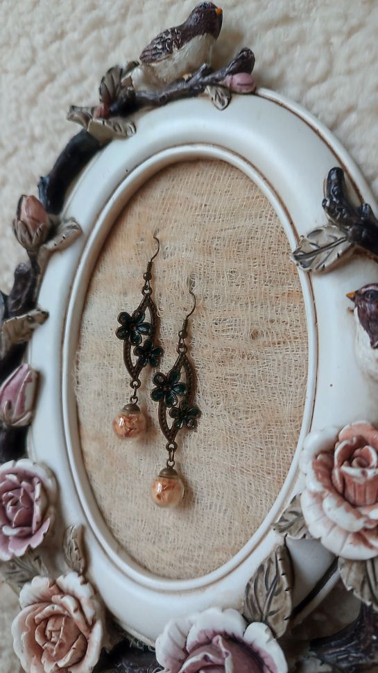 Хербаризиран цвят на роза, месингови елементи, стъклена сфера с диаметър 1 см; дължина – 6 см