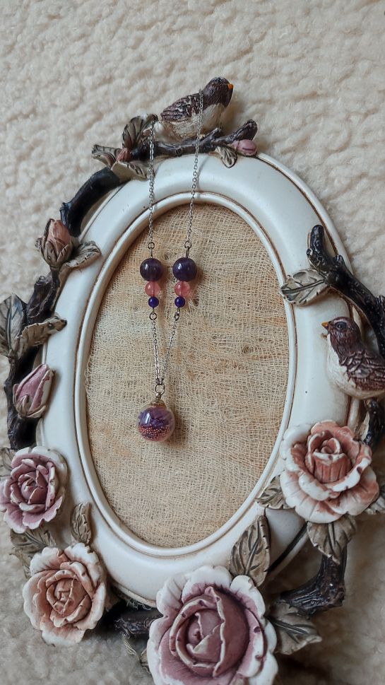 Колие с хербаризирано мушкато, черешов кварц, аметист, стомана, стъклени перли. Стъклена сфера с диаметър 1,5 см