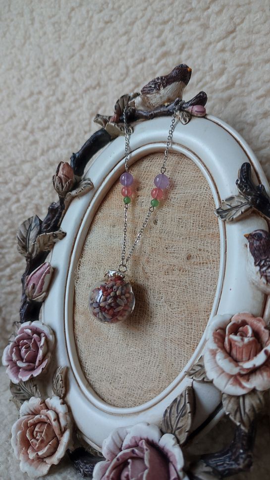 Колие с хербарициран цвят на лавандула и ерика – зелен авантюрин, черешов кварц, аметист, стомана. Диаметър на стъклената сфера – 25 мм; дължина на верижката 70 см