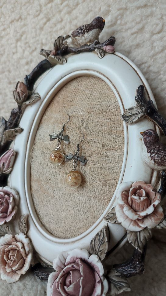 Обеци с хербаризирана роза, материали – месингов елемент панделка, стомана, стъклена сфера с диаметър 1 мм, дължина 4 см