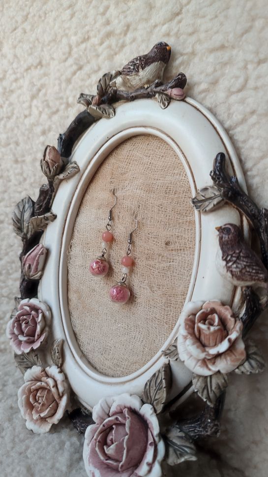 Обеци – хербаризирано мушкато, седеф, ягодов кварц, стоманени елементи, стъклена сфера с диаметър 1 см, дължина – 4 см