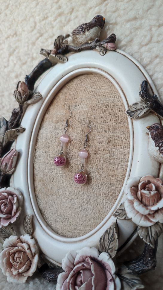 Обеци стъклени сфери диаметър 1см, стъклени перли, ахат, котешко око, стоманени елементи; дължина 4 см